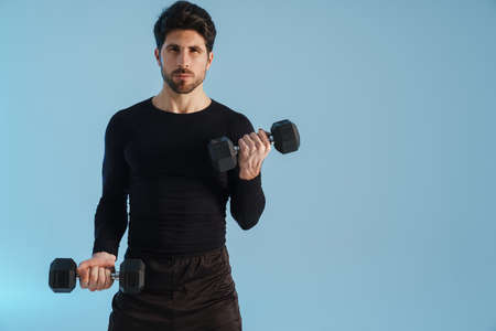 Handsome athletic sportsman working out with dumbbells isolated over blue background