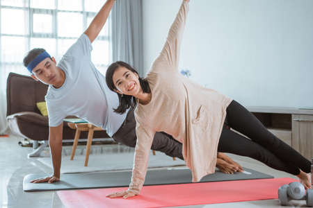 Side view of young couple doing warm up exercise outdoors on terrace, sport and healthy lifestyle concept.