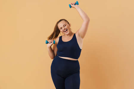 Young woman wearing sport suit doing exercise with dumbbells isolated over beige background
