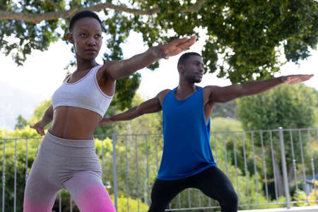 African american couple exercising practicing yoga on sunny garden terrace. staying at home in isolation during quarantine lockdown.