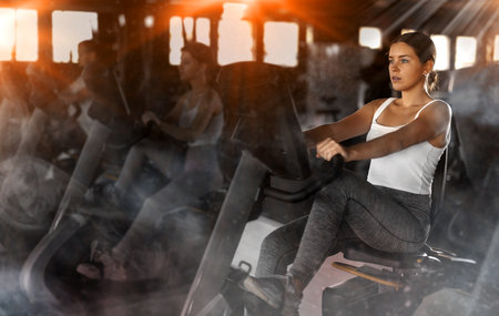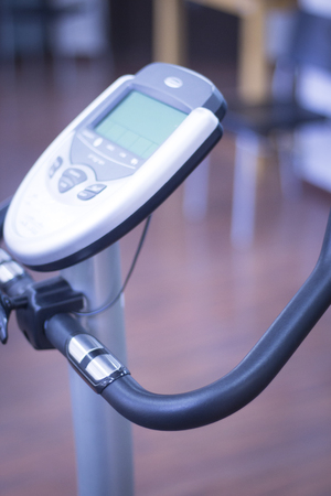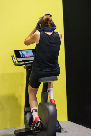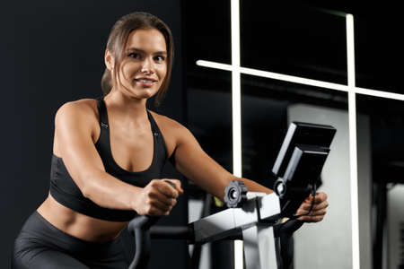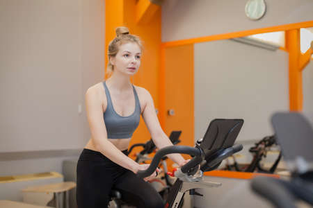 Photo of a sporty woman doing exercise on an electrical bicycle machine over the comfortable gym as a background.