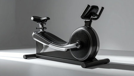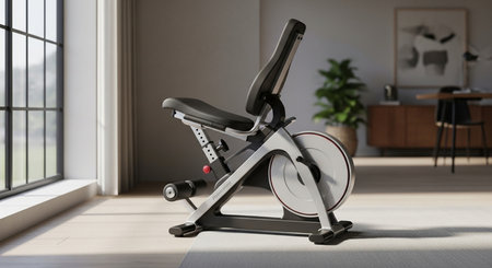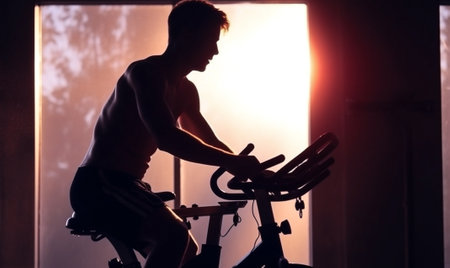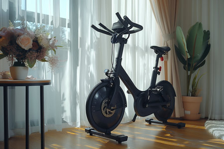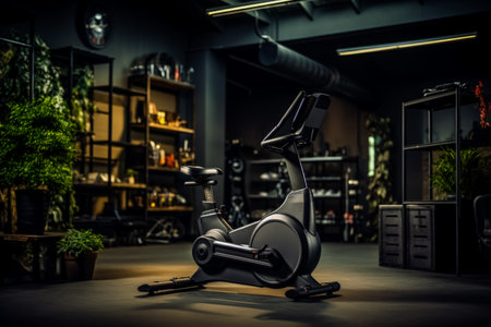 In a quiet, focused space, a state-of-the-art exercise bike stands ready. The dramatic lighting highlights its sleek design, symbolizing the dedication and power behind every workout.
