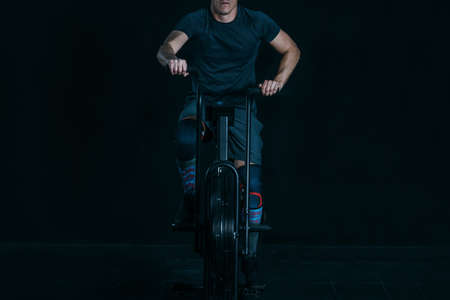 A young man on an exercise bike with a beard on a dark background.Training on an exercise bike in the gym.