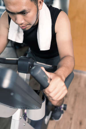 Caucasian man exercising in the gym riding stationary bike indoor cycling.