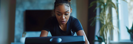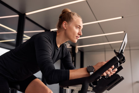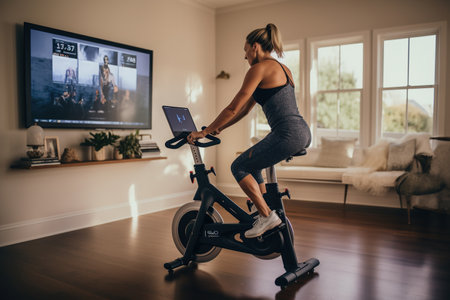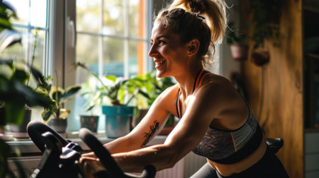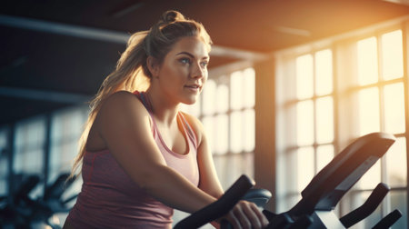 fit woman cycling gym fitness training workout home sport exercise cardio. Generative AI.