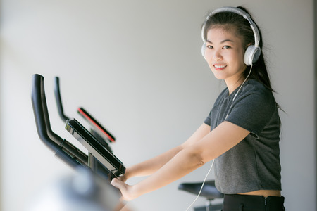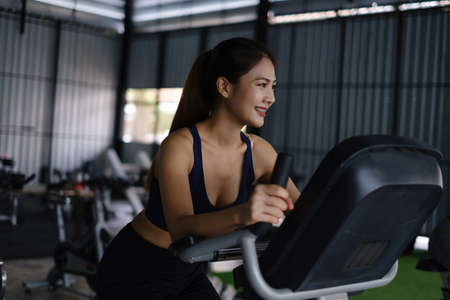 Asian woman exercising at the gym on a cross trainer, Woman training in a fitness club