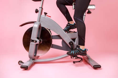 Portrait of the bike simulator and womens legs in black sneakers and leggins, cardio workout, training. Indoor studio shot isolated on pink background.