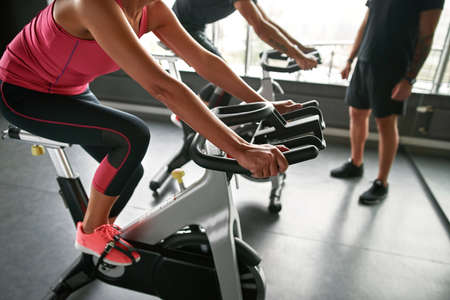 exercise concept The two sport club participants playing exercise bike machine for doing their cardio beside each other.
