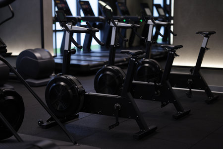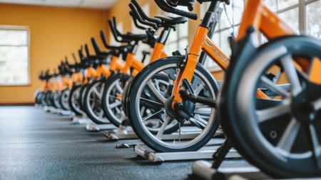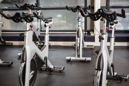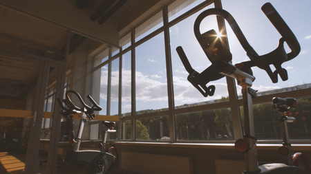 Stationary Spinning bicycles. Indoor cycling for lifestyle design. Fitness background. Healthy lifestyle background. Spinning class with empty bikes. Sport background. Sport, recreation, lifestyle. Fitness workout.