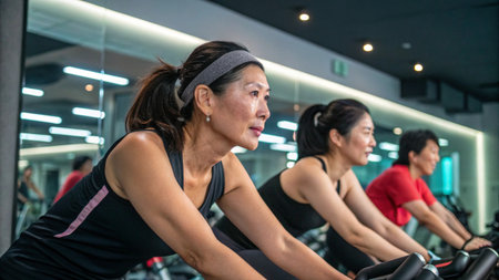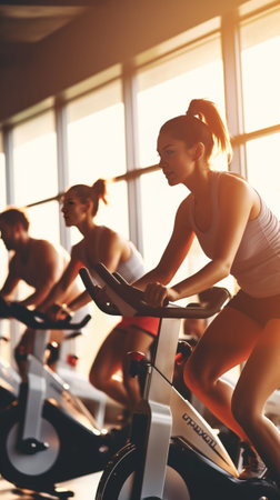 Women cycling in a gym class, focused on indoor exercise and healthy lifestyle