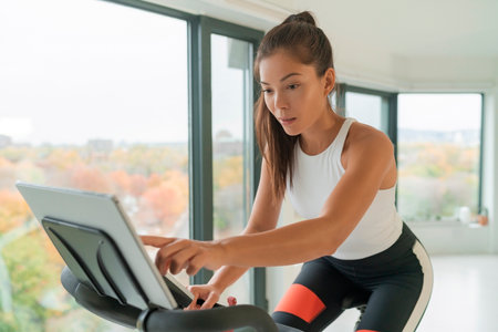 Home cycle workout Asian fit athlete woman training on stationary bike doing online cycling exercise class biking during livestream on screen.
