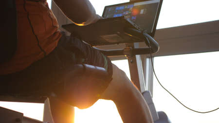 Young man practicing on the exercise bike simulator at home by window looking on the city during sunset with lens flare effects
