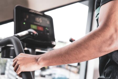 Young man doing exercise on elliptical cross trainer in sport fitness gym club