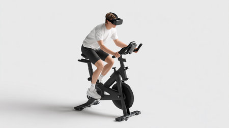 Man in VR glasses riding a stationary bike. 3D Rendering
