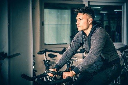 Attractive young man exercising in gym: spinning, exercizing on stationary bike