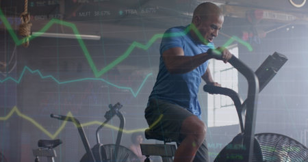 Image of graph processing data over caucasian man cross training on elliptical at gym. Fitness, exercise, strength, data, digital interface and technology digitally generated image.