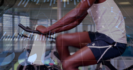 Image of data processing on graph over african american man cross training on elliptical at gym. Fitness, exercise, strength, data, digital interface and technology digitally generated image.