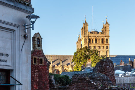 Exeter. June 02, 2018. Beautiful, medieval houses around the square near the Exeter Cathedral. Devon, South West England, United Kingdom