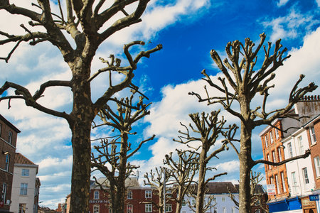 Leafless trees against a vibrant blue sky with fluffy clouds, showcasing a stark contrast between nature and the colorful facades of urban buildings in the background in York, North Yorkshire, England.