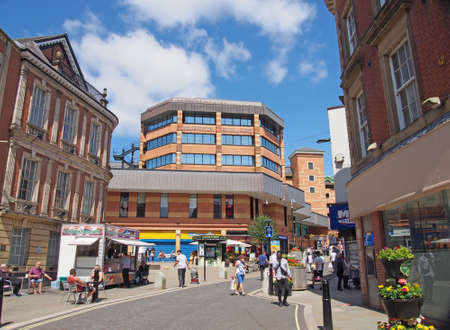 Gloucester, UK - August 17, 2015: Commercial and pedestrian street in Gloucester town center a cloudy day