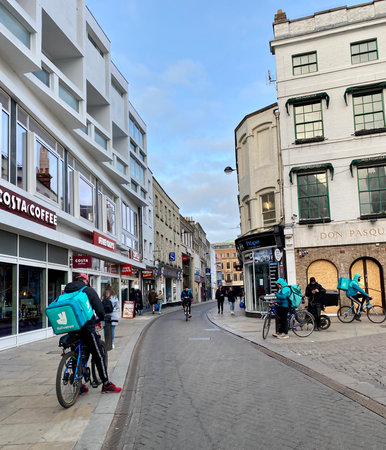 Cambridge, United Kingdom - April 2, 2021: Deliveroo riders in Cambridge city center