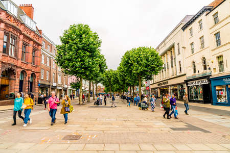 York, UK - June 22, 2021: People walking past restaurants and cafes on a street in York, a walled city in northeast England that was founded by the ancient Romans.