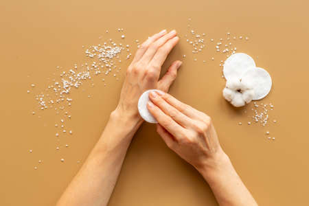 Close-up photo, female hands apply peeling pink scrub. Skin care. Healthy hand skin concept, beauty treatment
