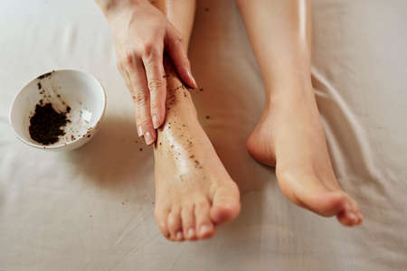 Girls legs close-up with coffee scrub. Spa, beauty treatments, relaxation. Restoring skin elasticity. High quality photo