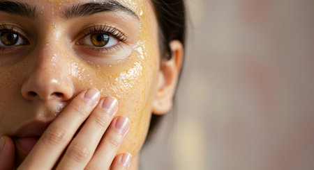 African american woman gently exfoliating face with natural scrub, enjoying skincare routine and self care at home in warm lighting.