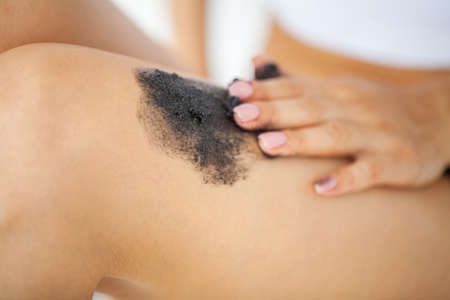 woman applying body exfoliating scrub. natural organic coffee polish on a woman's body.