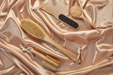 On an orange background, accessories for spa treatments, brushes for face and body massage