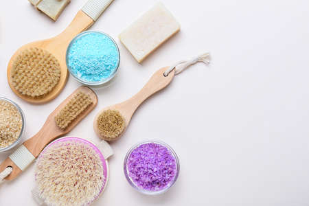 washcloth, bathing brush and heel foam. concept of accessories for shower, bath and spa salon