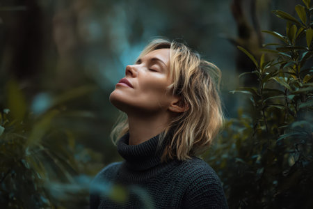 Young woman in a peaceful forest, breathing fresh air and enjoying the tranquility of nature.