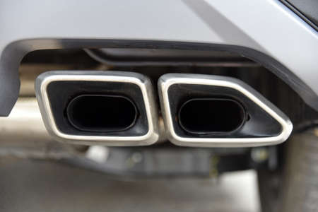 close-up of modern luxury car dual exhaust pipes, vehicle smog polluting the air