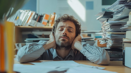 Man worn out at work looking straight ahead sitting in front of a large pile of files with his head leaning on his hand.