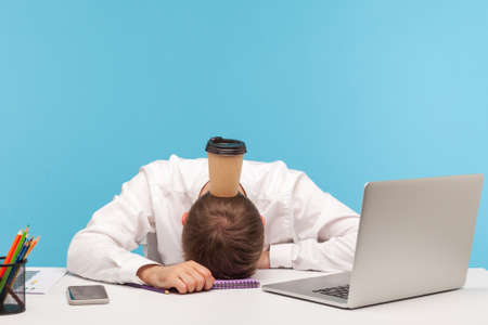 Overworked exhausted man office worker lying on table, paper coffee cup standing on his head, lack of energy, procrastination and professional burnout. Indoor studio shot isolated on blue background