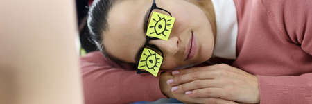 Spectacles with tired young woman sleeping on book