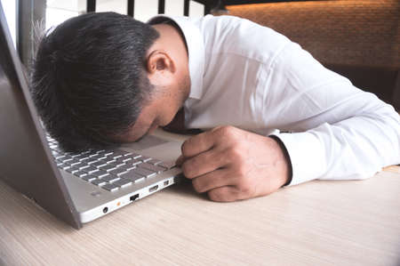 Business partners concept a male young business man sleeping on a desk with a laptop and document after working for long time.