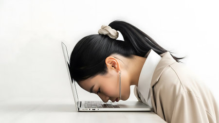 Young girl lost hope and holding her head, tired and upset unhappy freelancer after failure at work concept photo
