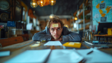 Stressed young man in formal wear, sitting at a cluttered desk with a note on his forehead in an office setting.