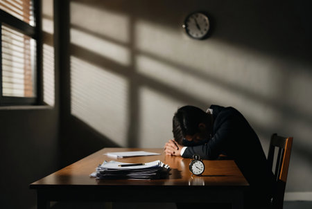 A person with curly hair sits at a desk, leaning forward with one hand on their head, focused on a silver laptop. The scene includes papers, a cup, and dramatic shadows from a window, suggesting a moment of deep concentration or study.