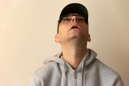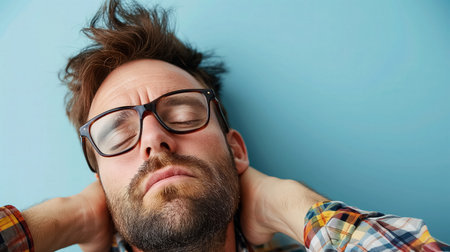 A weary man with a scruffy beard and glasses relaxes by leaning back with his eyes closed against a calm blue background.