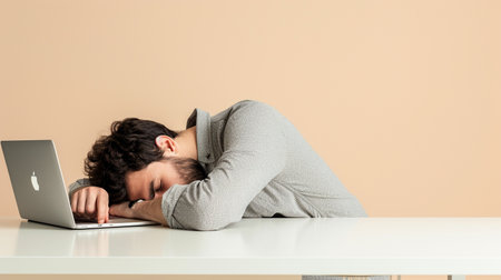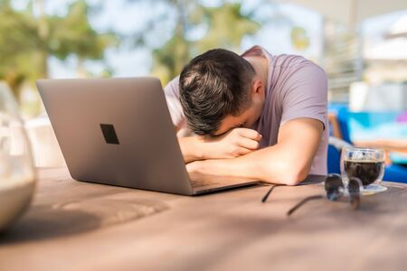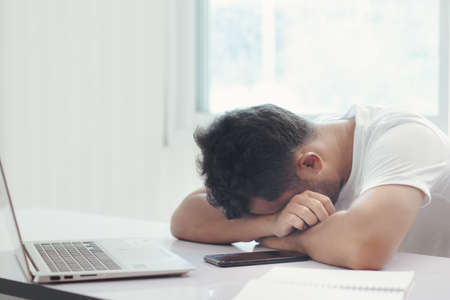 Tired man with chronic fatigue syndrome cfs sleeps with laptop.
