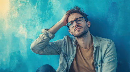 A young man with glasses sits against a blue wall rubbing his forehead in a gesture of frustration during the day.