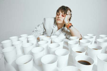 Sleepy girl with lots of paper cups of coffee. Hard morning, chronic lack of sleep and caffeine addiction concept