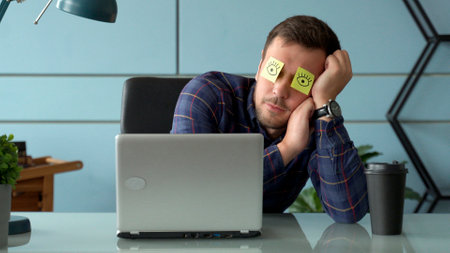 Tired comic male manager pretends working sleeping with stickers on face sits at desk with laptop.
