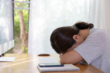 Young exhausted businesswoman lying on the table and sleeping in front of laptop computer she tired after hard work at office