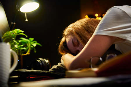 Tired woman. Hard working. Freelance job. Project deadline. Exhausted lady sleeping leaning hands on workplace with laptop table lamp light evening home interior dark window.