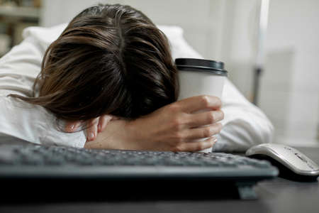 Woman sleeping on table at workplace. Overtime work concept. Working at night