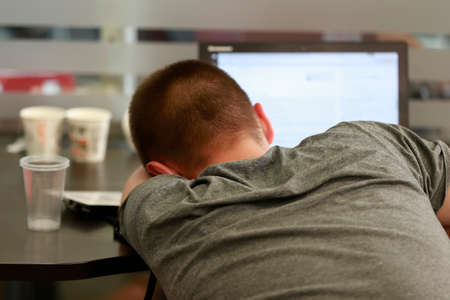 Belarus Minsk 06 August 2016 The Park of High Technologies. Competitions programmers.The programmer is tired. The student was tired at the computer. I fell asleep at the computer